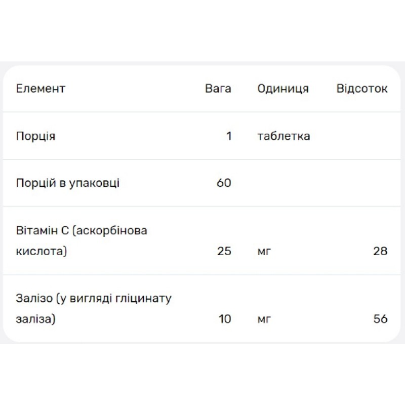 Самой важной функцией железа является транспортировка кислорода по всему организму. В составе эритроцитов находится белок гемоглобин, каждая молекула которого обладает четырьмя атомами железа. Их задача - связывать кислород, который проходит кровеносные сосуды легких, и доставлять его в ткани. Мышечный гемоглобин или миоглобин сохраняет и доставляет кислород в ткани мышц. Также железо играетважную роль в обмене веществ – оно помогает нормализовать уровень холестерина в крови, контролирует разрушение печенью ядовитых веществ, помогает иммунной системе бороться с инфекциями и вирусами. Признаками нехватки железа могут быть усталость, головокружение, холодные руки и ноги. Глицинатная форма железа оказывает мягкое воздействие на желудок, не имеет вкуса и хорошо переносится людьми, чувствительными к пищевым добавкам железа.