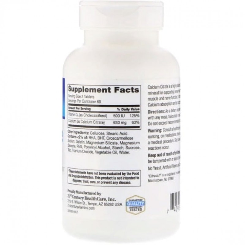 Цитрат кальция - это хорошо усваиваемая форма кальция, важный минерал для поддержания здоровья костей. Кальций также работает для поддержки функции мышц и нервов. Витамин D3 добавляется для помощи в усвоении кальция и в качестве поддержки здоровой иммунной функции.