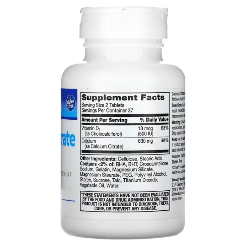 21st Century Calcium Citrate Maximum + D3 - это минеральная добавка, которая содержит цитратную форму кальция с витамином D3. Цитратный кальций легко усваивается и обладает значительно более высокой биодоступностью по сравнению с обычной карбонатной формой.