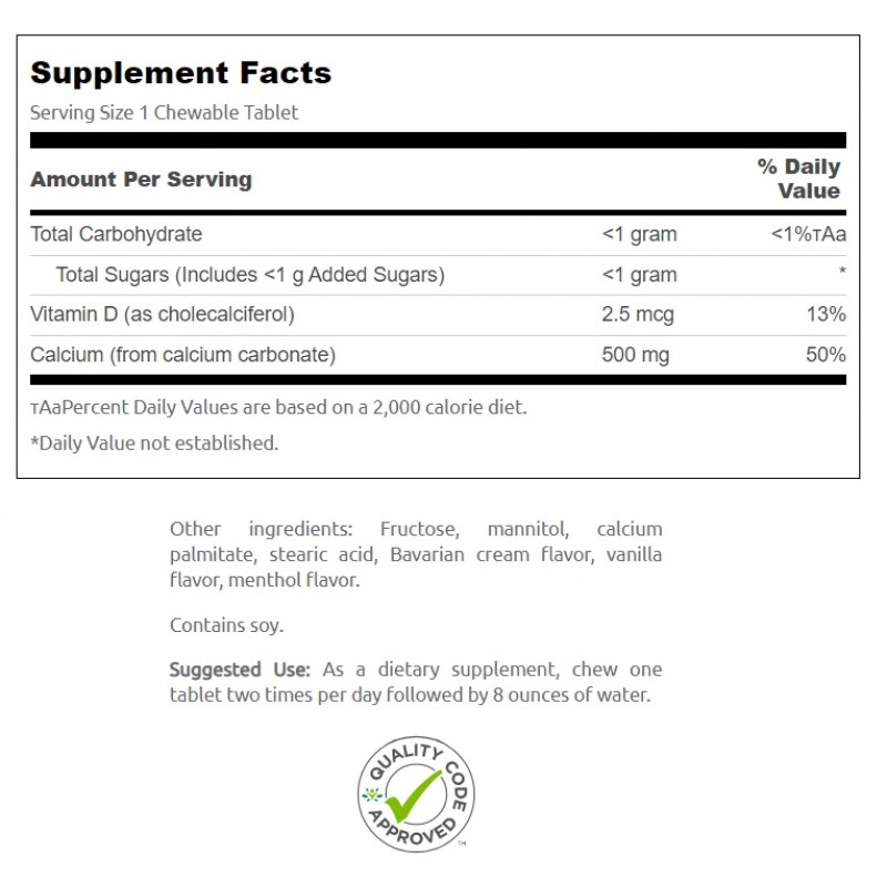 Кальций никогда не был таким вкусным! Идеально подходящий для людей, которым трудно глотать таблетки, эта специальная питательная формула для костей сочетает в себе 500 мг кальция (из карбоната кальция) и 100 МЕ витамина D в вкусных жевательных таблетках со вкусом ванили, содержащих всего три калории на порцию.