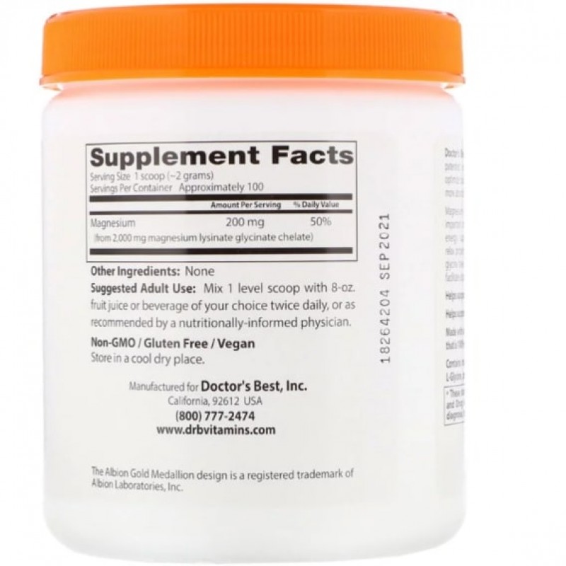 Легкоусвояемый порошок магния от Doctor's Best использует запатентованную органическую хелатированную форму магния для повышения биодоступности и желудочно-кишечной переносимости. Он не содержит буферных веществ и всасывается легче, чем оксид магния.
