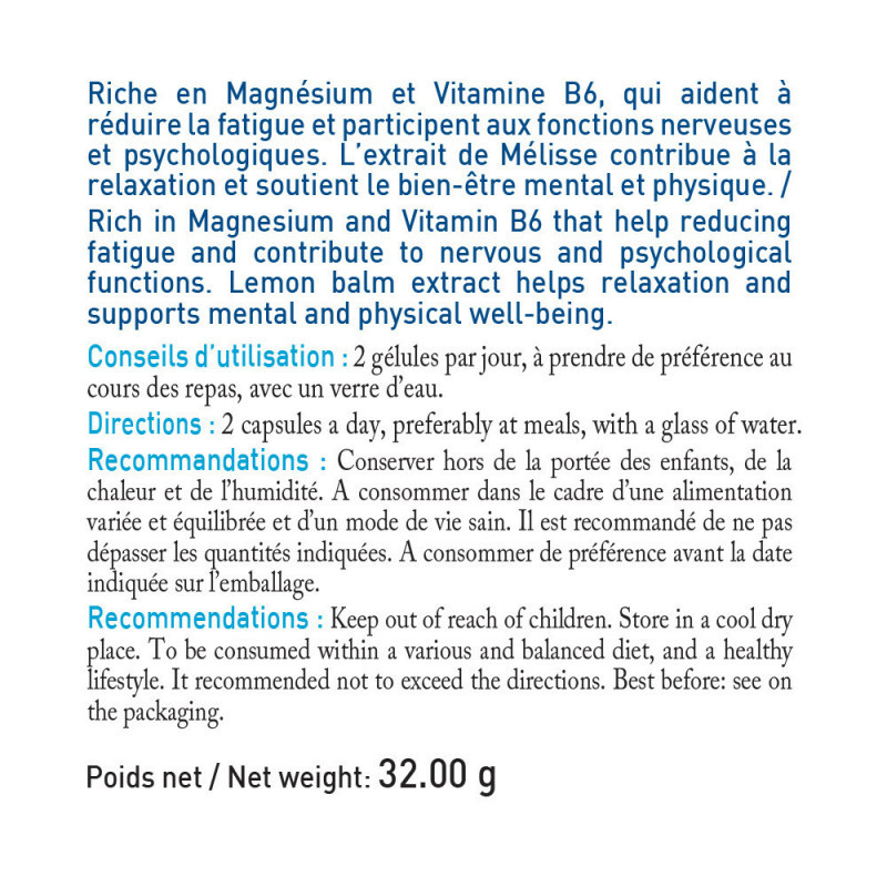 Формула NUTRIEXPERT MAGNESIUM MARIN B6+ сочетает в себе морской магний, витамин B6 и мелиссу, которые помогают поддерживать передачу нервного импульса и расслабление мышц, способствуют хорошему умственному самочувствию и регулируют настроение.