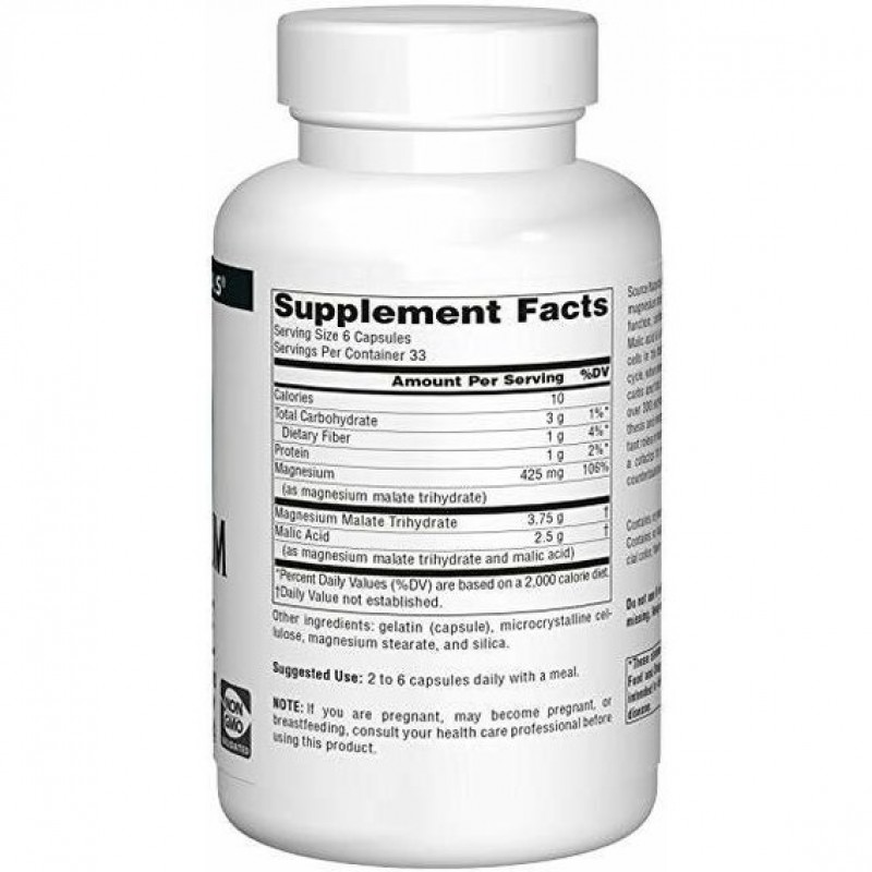 Source Naturals Magnesium Malate — компаунд магния и яблочной кислоты. Он поддерживает мышечную функцию, здоровье сердечно-сосудистой системы и производство энергии. Яблочная кислота — натуральная фруктовая кислота, присутствующая в почти во всех клетках организма и занятая в лимонно-кислом цикле, в котором энергия удерживается во время метаболизма углеводов и жиров. Магний — необходимый кофактор более чем 300 ферментативных реакций метаболизм, синтеза АТФ и производства энергии. Магний играет важную роль в расслаблении мышц, как кофактор ферментов и за счет способности уравновешивать кальций в клетке.