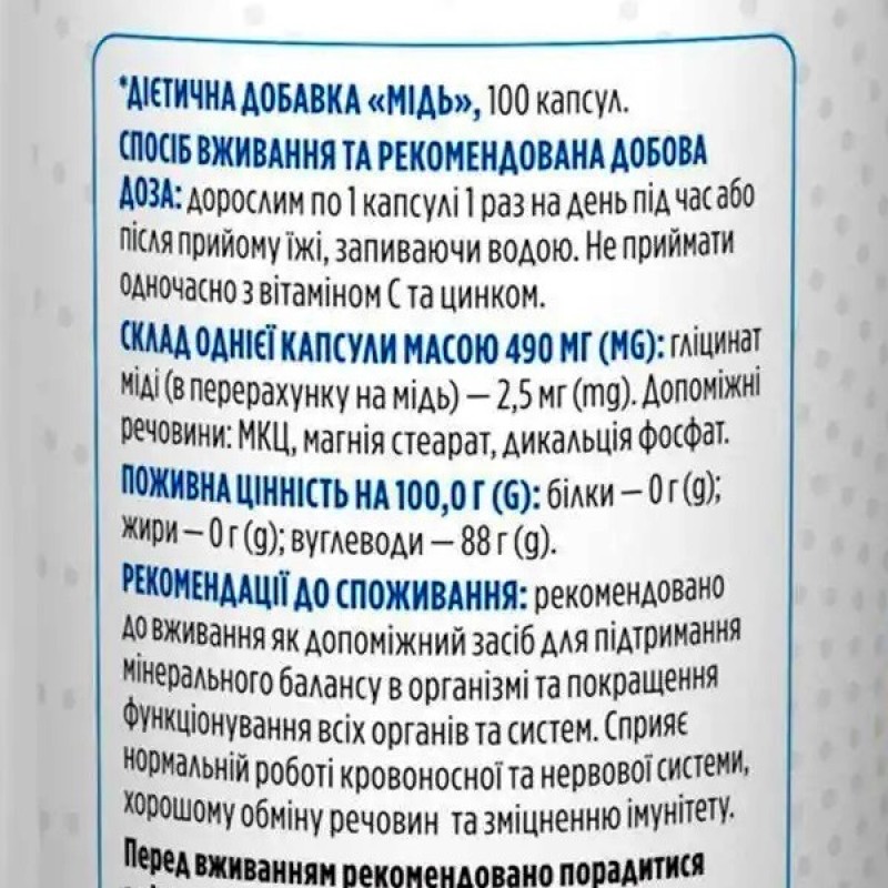 Пищевая добавка от украинского производителя Biotus обеспечит поддержку минерального балансу, в частности уровня меди в организме. Медь входит в состав ферментов, гормонов. Она способствует повышению повышению эластичности стенок кровеносных сосудов, участвует в производстве красных кровяных телец, поддержке работы сердца, регулирования артериального давления и сердечных сокращений. Медь входит в составную часть коллагена, поэтому она положительно действует на упругость кожи, крепости волос и ногтей. Медь важна для образования прочной и гибкой соединительной ткани, поддержки крепости костей, хрящей, сухожилий. Медь от Biotus в форме глицинат для лучшего усвоения организмом.
