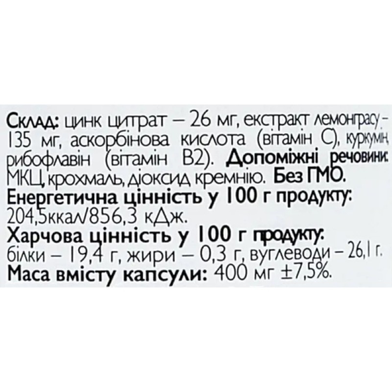 Цинк цитрат All be Ukraine Zinc+ с витамином С и лемонграсом - это диетическая добавка, содержащая цинк цитрат, экстракт лемонграсса, витамин С, куркумин и витамин В2. Цинк цитрат – это биодоступная форма цинка, которая хорошо усваивается организмом. Цинк является важным минералом для иммунной системы, кожи, волос и ногтей, а также поддерживает здоровье мужской репродуктивной системы. Экстракт лемонграсса помогает улучшить пищеварение, уменьшить воспаление и боли в суставах.
