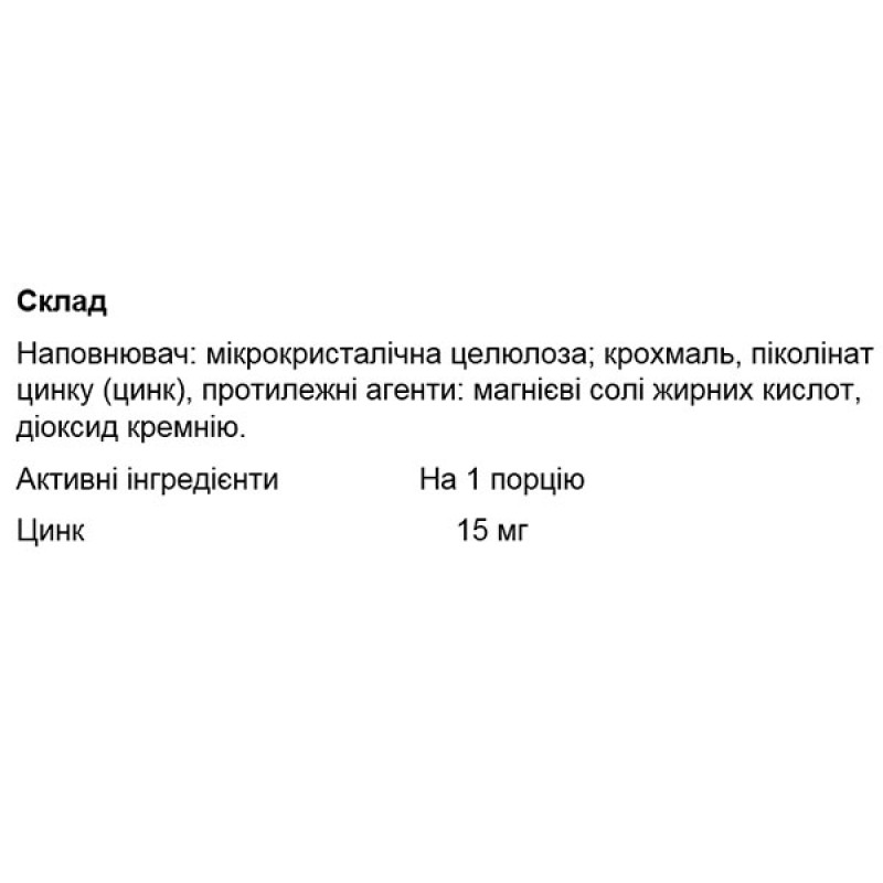 Источник цинка – одна порция биологически активной добавки содержит 15 мг цинка в высокобиодоступной форме пиколината цинка.