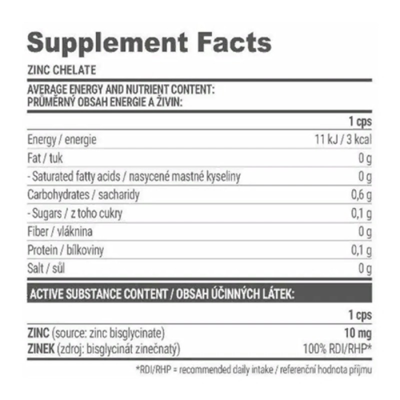Одна капсула Zinc 100 Chelate содержит 10 мг цинка, что составляет 100% нормы потребления (рекомендуемой суточной дозы). Мы рекомендуем принимать по 1-2 капсулы в день — суточная доза также зависит от интенсивности вашей тренировки, диеты и веса вашего тела.