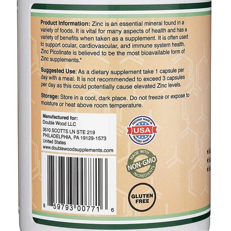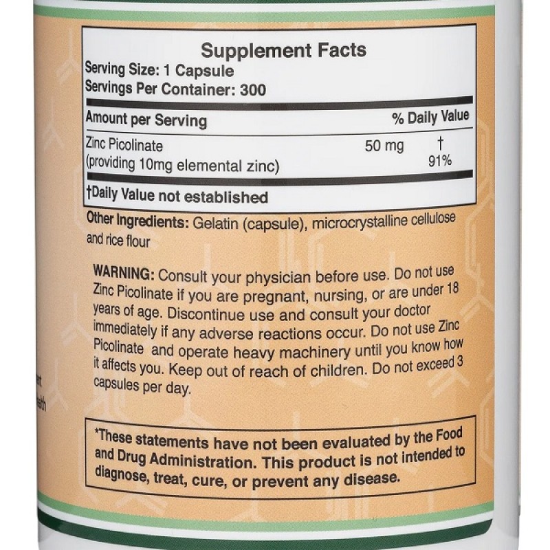 Наш пиколинат цинка представляет собой хелат цинка и пиколиновой кислоты, который является одной из наиболее биодоступных форм цинка и содержит 10 мг элементарного цинка на капсулу, что немного больше, чем дневная потребность средней женщины (8 мг), и немного меньше, чем в среднем суточная потребность человека (11 мг).