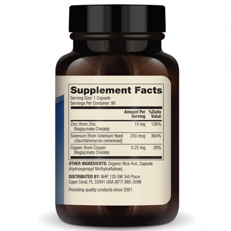 Цинк улучшает поглощение витаминов и питательных веществ и действует как мощный антиоксидант. Цинк играет важную роль для здоровья: в нормализации гормонального фона (особенно важен для репродуктивной функции мужчин), поддержании здоровья сердца и печени, артериального давления в нормальном диапазоне, в росте мышц и процессе выздоровления. В составе продукта селен - еще один минерал, который столь же важен, как и цинк. Селен имеет эффективное действие на здоровье клеток (предотвращает повреждение свободными радикалами) и иммунное здоровье. Для предупреждения снижения уровень меди в организме, в составе продукта 0,25 мкг меди. Медь способствует улучшению работы сердечно-сосудистую систему, здоровью костей и поглощению железа.