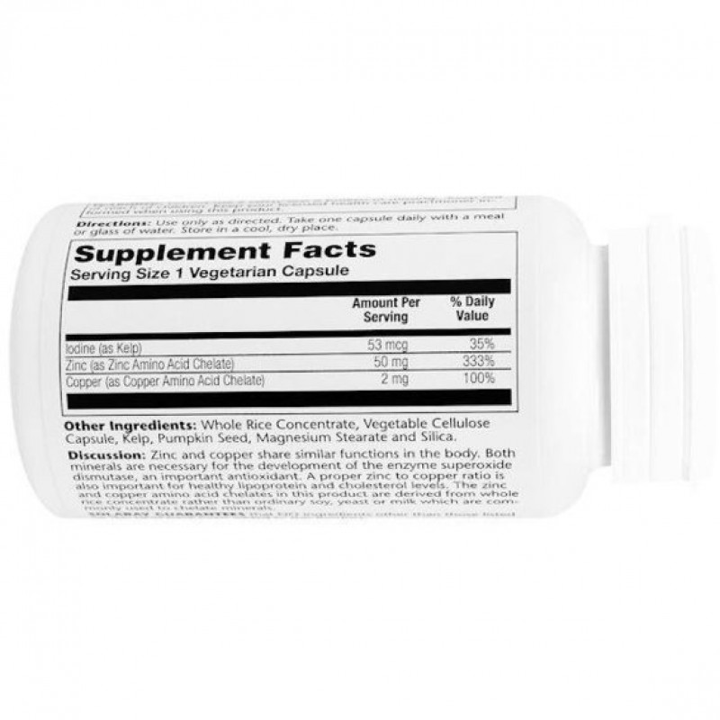 Цинк и Медь (Zinc Copper), Solaray имеют сходные функции в организме. Оба минерала необходимы для развития фермента супероксиддисмутазы (СОД), важного антиоксиданта. Надлежащее соотношение цинка к меди имеет важное значение для здоровья клеток и кровообращения. Хелаты цинка и меди в этом продукте получают из цельного рисового концентрата, а не из обычной сои, дрожжей или молока, которые обычно используются для хелатирования минералов.