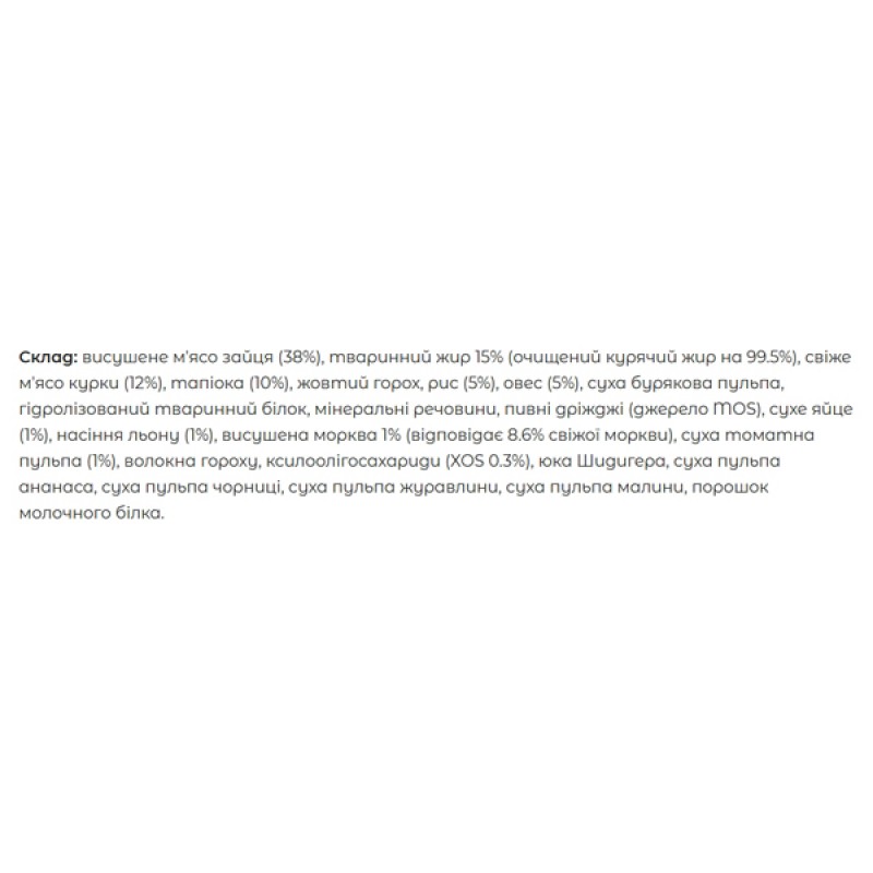 Прекрасный вкус и привлекательный аромат мяса зайца в сочетании с высококачественными ингредиентами – в составе сбалансированного и полноценного питания. Этот вкус не оставит равнодушным вашего питомца. Содержимое X.O.S. помогает сохранить естественный баланс кишечной микрофлоры, способствует оптимальному усвоению питательных веществ и повышает иммунитет. L-карнитин провоцирует метаболические процессы в организме, поддерживает рациональный вес животного. Омега-3 и омега-6 жирных кислот для красоты шерсти и здоровья кожи. Оптимальный баланс омега-3 и омега-6 в составе корма очень важен для поддержания кожи и шерсти в отличном состоянии.