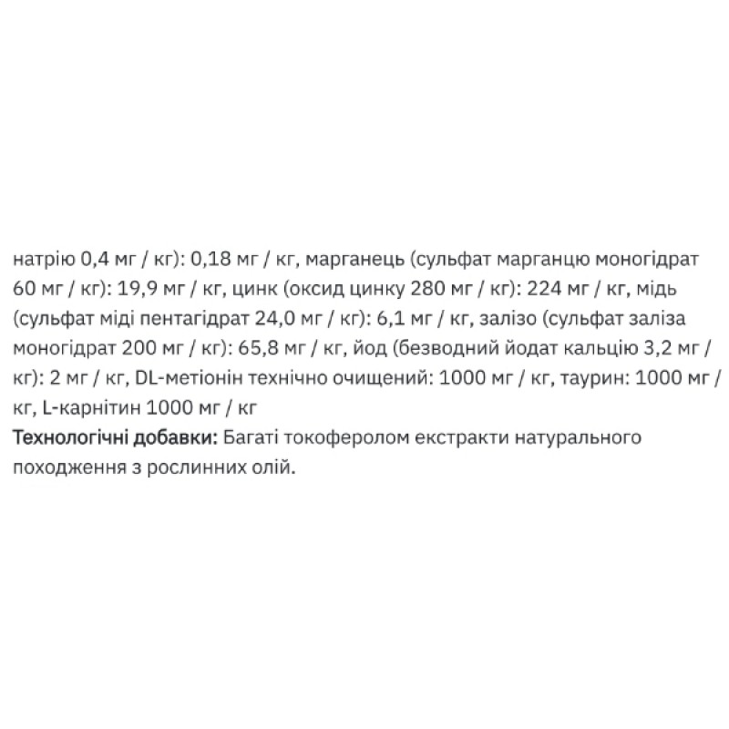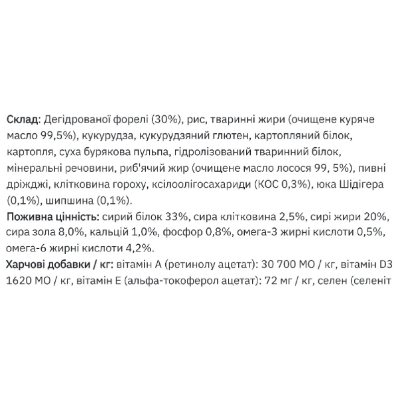 Главным источником белка в корме является форель, которая обогащена полиненасыщенными жирами, а также ксилоолигосахаридами, отвечающими за здоровое состояние кишечника.