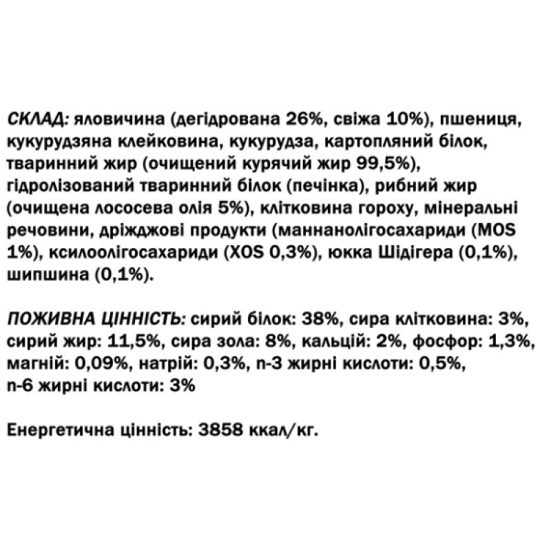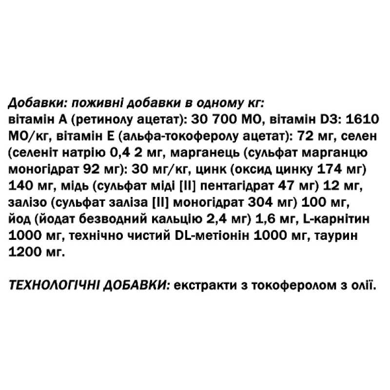 В рецептуру готового рациона добавлены крупы (пшеница, кукуруза), овощи, бобовые, животный и рыбий жиры (куриный жир и лососевое масло), витамины и минеральные вещества (юкка Шидигера, шиповник, витамины А, Е, D3, селен, марганец, цинк, железо, медь, йод, L-карнитин и другие), а также экстракты растительных масел.