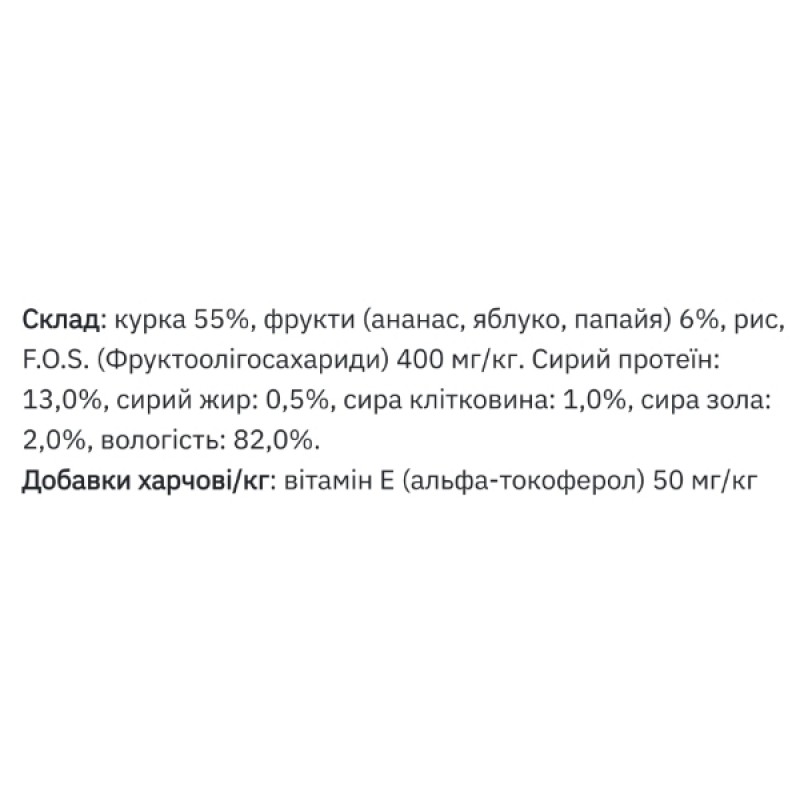 Влажный корм для взрослых кошек и котов Monge Fruits Chicken with Fruits состоит из отборных ингредиентов. В состав входят: куриная грудка, в которой много полезного белка, и фруктовая смесь, обогащающая организм пушистика витаминами. Влажный корм содержит также пребиотики и фруктоолигосахариды (F.O.S.), улучшающие работу кишечника.