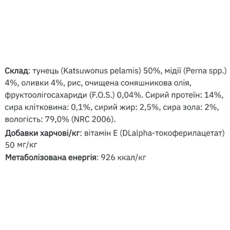 В состав рациона входят мидии (источник высокой биологической ценности белка, необходимого для поддержания сухой массы), океанический тунец (также насыщает ценным белком организм вашего питомца), оливки (содержат жир и антиоксидантные витамины). Купите своему коту влажный корм от Monge и наслаждайтесь его благодарным мурлыканьем, ведь это не просто полезно, но и вкусно!