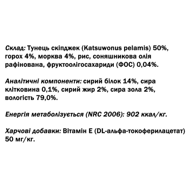 - Первым ингредиентом является океанский тунец, рецептура которого обогащена фруктоолигосахаридами (ФОС), пребиотиками, поддерживающими здоровье кишечника.