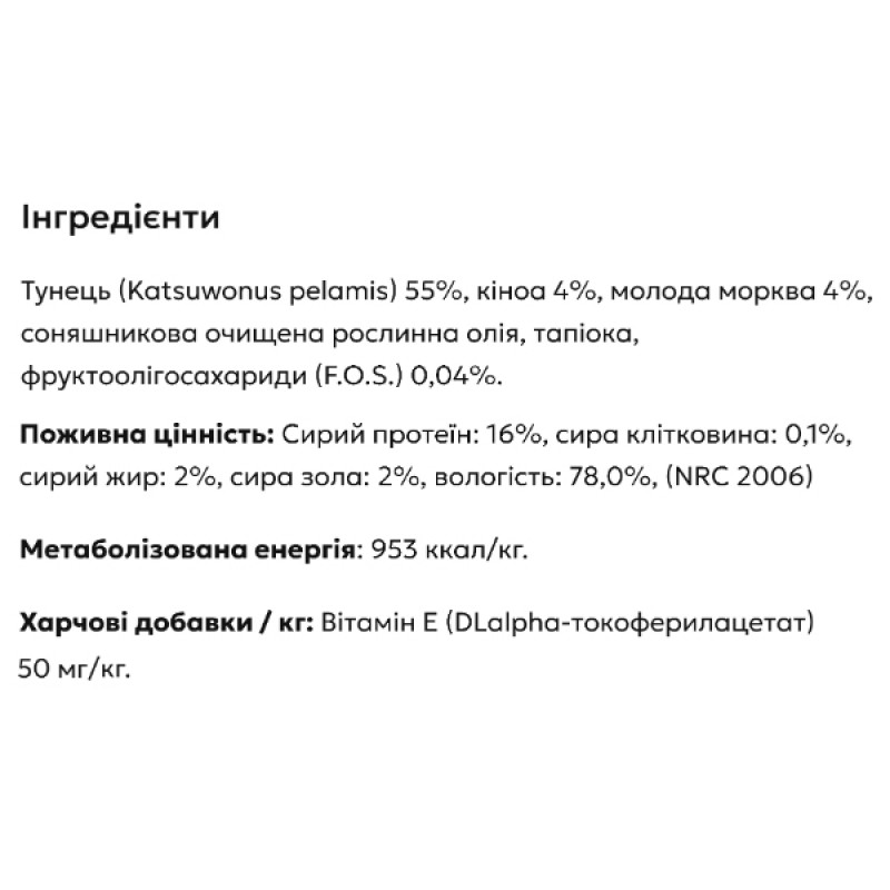 - Первым ингредиентом является океанический тунец, а рецептура обогащена фруктоолигосахаридами (FOS), пребиотиками, поддерживающими здоровье кишечника.