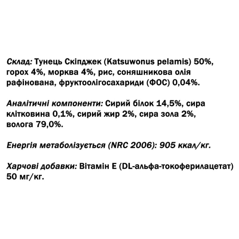 - Первым ингредиентом является океанский тунец, а его рецептура обогащена фруктоолигосахаридами (ФОС), пребиотиками, поддерживающими здоровье кишечника.