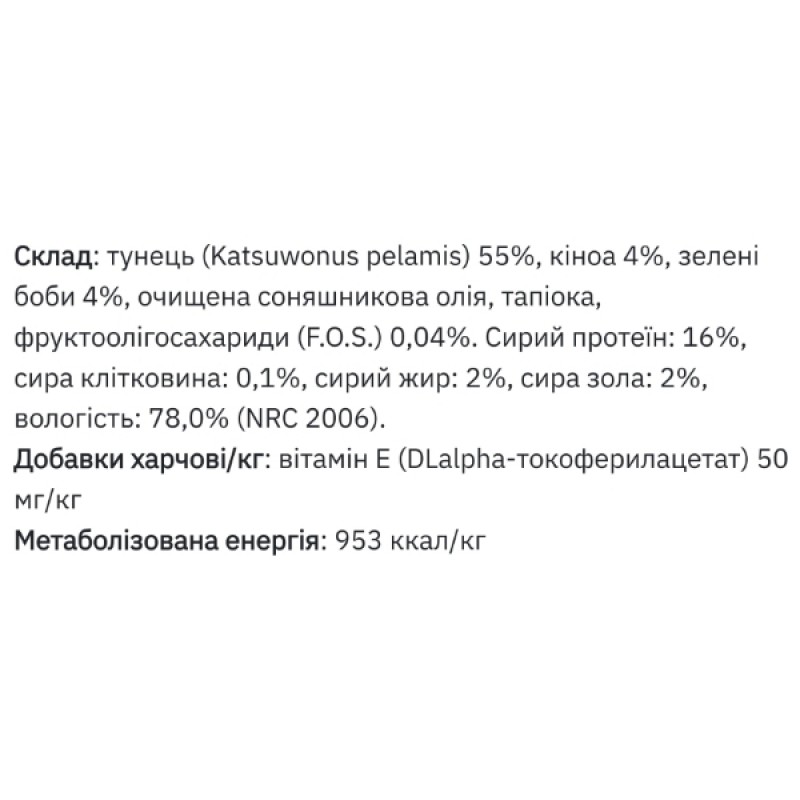Зеленые бобы полезны для здоровья желудочно-кишечного тракта, так как содержат большое количество растительной клетчатки. Океанический тунец насыщает организм кота легкоусвояемым белком. Фруктоолигосахариды (FOS) и пребиотики поддерживают здоровье кишечника. Киноа насыщает антиоксидантами и минералами, заряжает энергией на весь день.