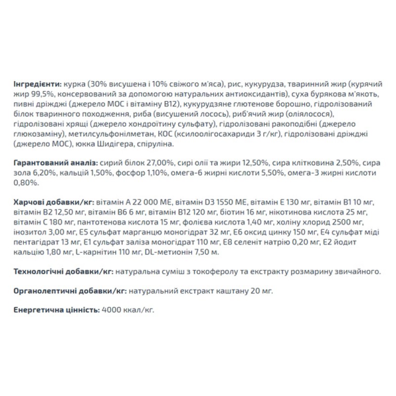 Полноценный сбалансированный рацион для ежедневного питания взрослых собак больших пород с нормальной физической активностью. Сниженное содержание жира для поддержания идеального веса. Сниженный уровень жира и оптимальное содержание белков и углеводов способствуют сохранению идеальной формы и уменьшению нагрузки на суставы собак больших пород. Высокий уровень белка в составе корма и содержание в нем L-карнитина позволяют собаке долгие годы сохранять активность и хорошую физическую форму. L-карнитин для улучшения обменных и энергетических процессов в мышцах. Активизирует обмен жиров, поддерживает обычную работу сердца и печени, провоцирует регенерацию клеток. Способствует поддержанию оптимального веса животного. Содержимое X.O.S. (Пробиотиков) помогает сохранить естественный баланс кишечной микрофлоры, способствует оптимальному усвоению питательных веществ и повышает иммунитет. Глюкозамин, хондроитин, кальций и фосфор для здоровья суставов. Эти вещества в составе корма способствуют нормальному функционированию суставов опорно-двигательного аппарата.