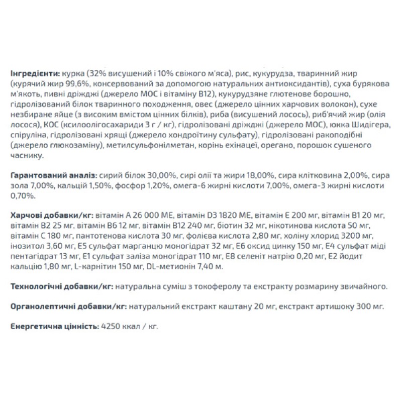 Глюкозамин, хондроитин, кальций и фосфор для здоровья суставов. Эти вещества в составе корма способствуют нормальному функционированию суставов опорно-двигательного аппарата. Комплекс лечебных трав и растений положительно влияет на растущий организм щенка. Богат биологически активными веществами и антиоксидантами, способствующими усилению защитных сил организма животного. Содержимое X.O.S. (Пробиотиков) помогает сохранить естественный баланс кишечной микрофлоры, способствует оптимальному усвоению питательных веществ и повышает иммунитет.