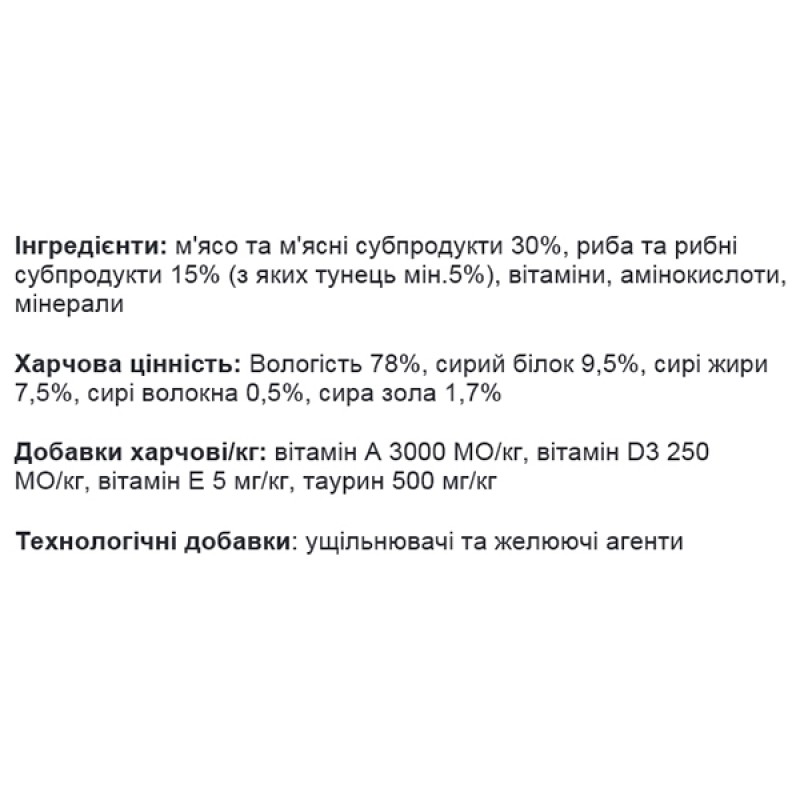 - Содержит таурин– аминокислоту, отвечающую за переваривание жиров, сохранение острого зрения, здоровье сердца и нервные ткани любимца.