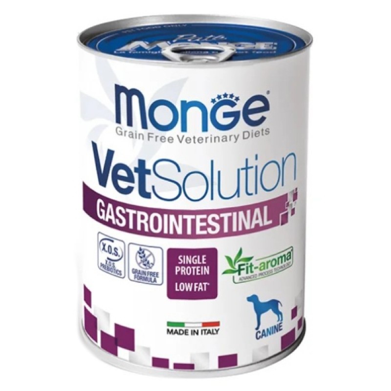Консервированный лечебный корм Monge VetSolution Gastrointestinal Dog Adult Wet — диета для собак всех пород в возрасте от 1 года, которые страдают гастроэнтерологическими заболеваниями. Содержит легкоусвояемые ингредиенты. Разработан для уменьшения нарушений всасывания в кишечнике и компенсации нарушения пищеварения. Содержит нуклеотиды для поддержки иммунной системы. Высокоусвояемый состав с повышенным содержанием натрия и калия.