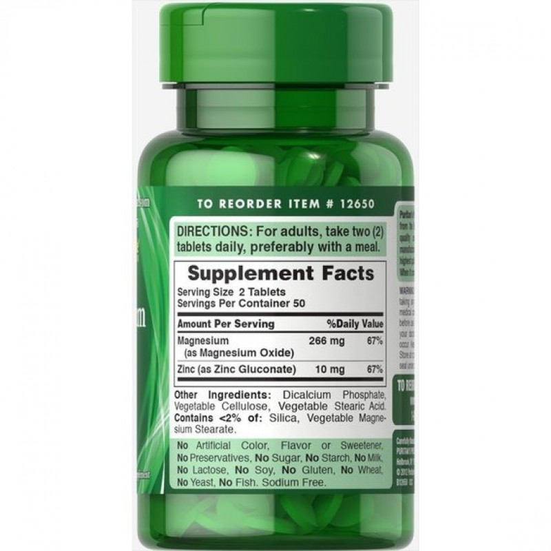 Puritan's Pride Magnesium with Zinc - в каждой таблетке содержится необходимое количество магния и цинка для полноценного и здорового функционирования организма. Магний способствует укреплению костей и поддерживает нервную систему. Цинк способствует росту клеток и укрепляет иммунную систему.