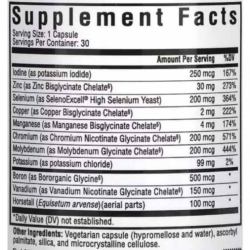 Комплекс Trace Minerals содержит 10 основных микроэлементов, необходимых для оптимального здоровья, в хорошо переносимых и биодоступных формах. Эта формула не содержит железа.
