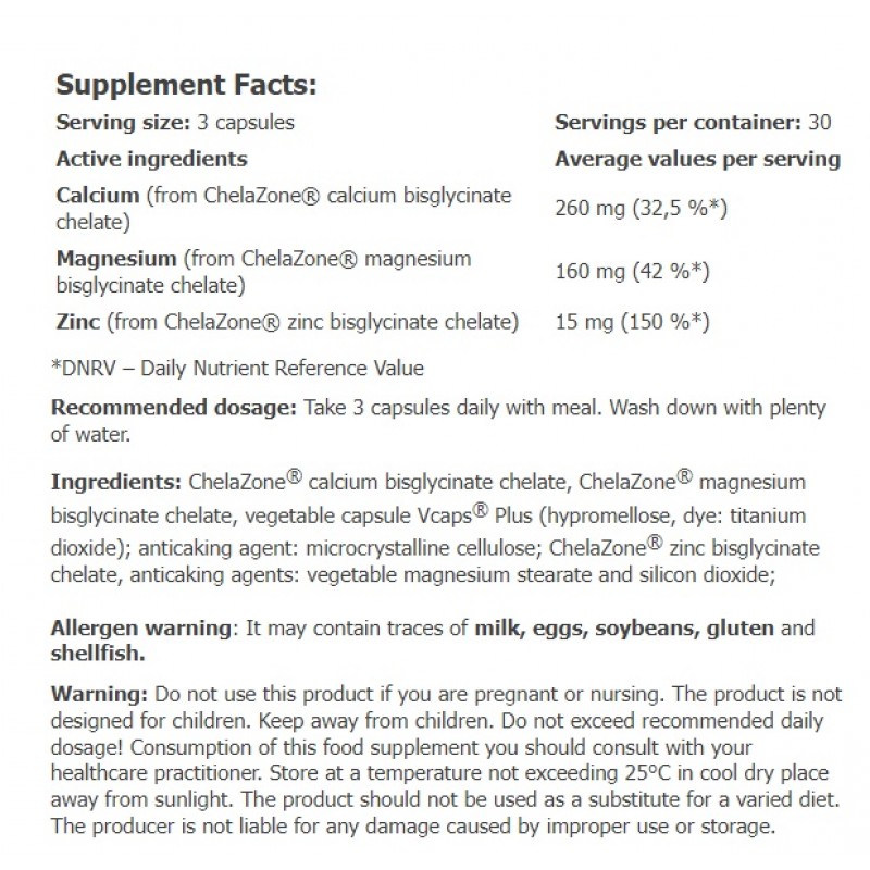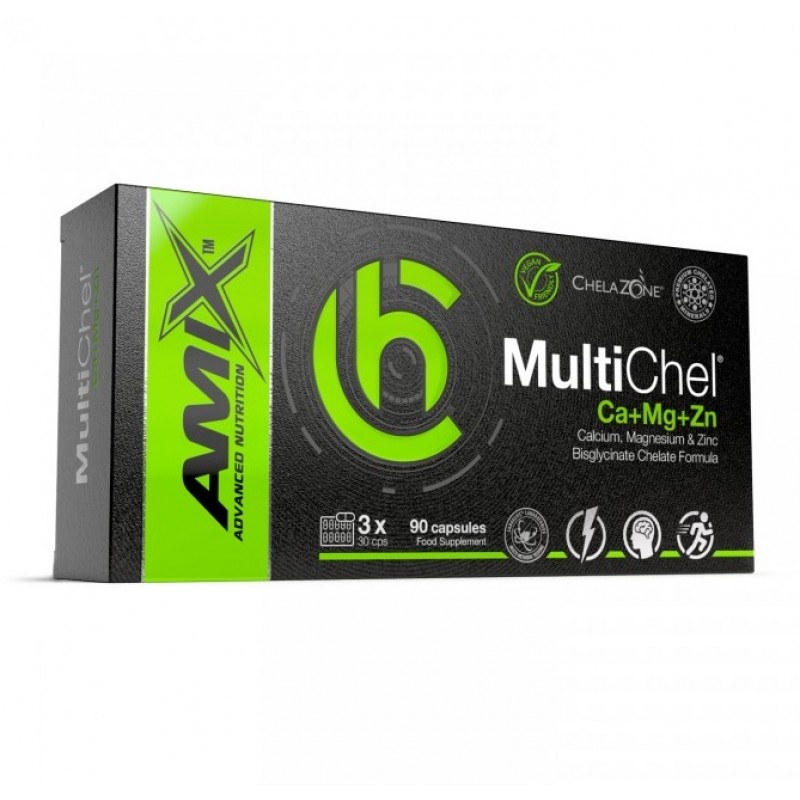 Amix Nutrition ChelaZone MultiChel Ca+Mg+Zn - это пищевая добавка со 100% содержанием наилучшей и легкоусвояемой формы кальция, магния и цинка в хелатной форме ChelaZone в растительной капсуле V- Caps Plus.