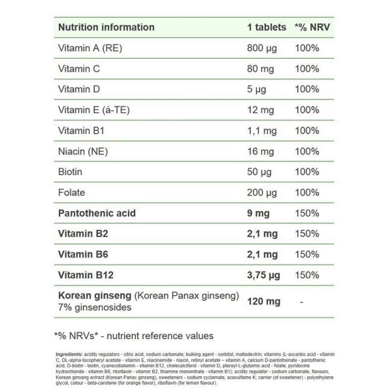 Ингредиенты: регулятор кислотности - лимонная кислота, наполнитель - сорбит, регулятор кислотности - карбонаты натрия, витамины (L-аскорбиновая кислота - витамин C, DL-альфа-токоферилацетат - витамин E, амид никотиновой кислоты - ниацин, ретинилацетат - витамин A, D-пантотенат кальция - пантотеновая кислота, D-биотин - биотин, цианокобаламин - витамин B12, холекальциферол - витамин D, птероилмоноглутаминовая кислота - фолат, гидрохлорид пиридоксина - витамин B6, рибофлавин - витамин B2, мононитрат тиамина - вит. В1); ароматизаторы, экстракт корейского женьшеня (Korean Panax ginseng), подсластители - цикламат натрия, сукралоза, ацесульфам К; носитель (подсластитель) - полиэтиленгликоль, краситель - бета-каротин (для аромата апельсина), рибофлавин (для аромата лимона).