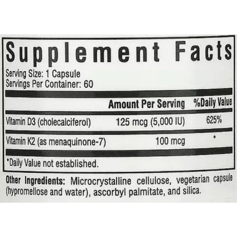 Витамин D и витамин K2 работают вместе синергически - каждое питательное вещество помогает другому в его функциях. Главная задача витамина D – обеспечить правильный рост и развитие костной ткани путем регуляции уровня кальция в организме. Кроме этого он восстанавливает мышцы, повышает иммунитет, поддерживает уровень фосфора в крови, участвует в регуляции артериального давления, а значит, и в работе сердца. Также витамин D необходим для правильного функционирования почек и щитовидной железы. Естественный источник витамина D – солнце, поэтому в первую очередь этот компонент усваивается кожей, оказывая на нее положительное влияние. Витамин К регулирует процессы свертывания крови, предотвращая, таким образом, внутренние и внешние кровотечения. Именно поэтому этот витамин врачи используют часто при тяжелых родах. Также витамин К принимает участие в синтезе важного белка остеокальцина, который отвечает за крепость костей. Таким образом он способствует предупреждению таких болезней как остеопороз и остеохондроз. К2 является одним из самых биодоступных, стабильных и полезных. Именно поэтому вам нужно принимать только одну порцию в день.
