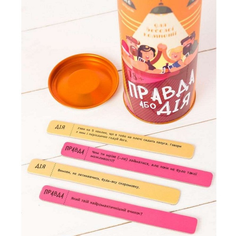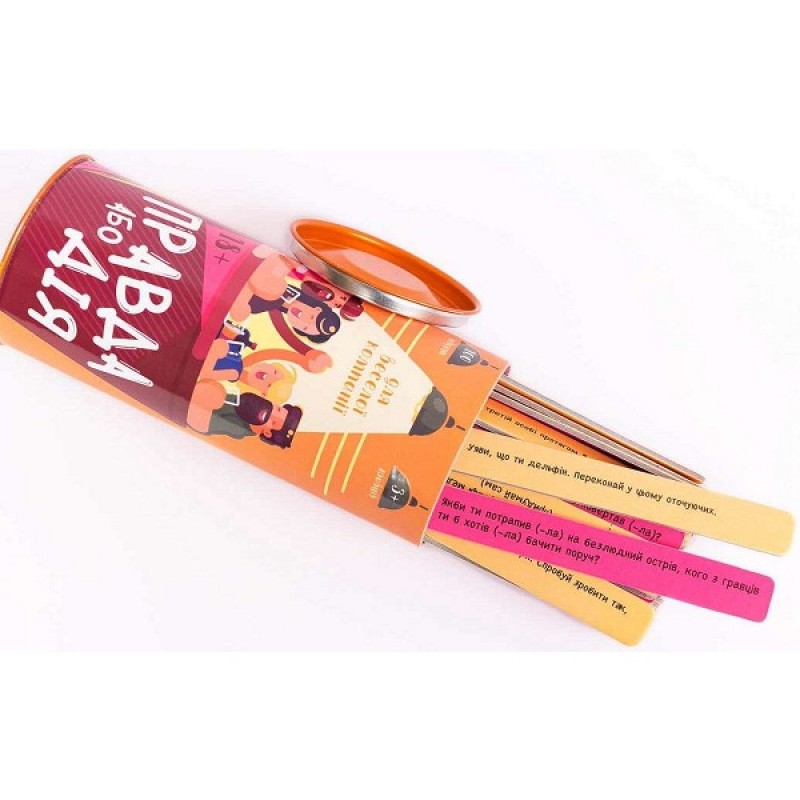 Кратко о правилах: Вы по очереди спрашиваете друг друга: «Правда» или «Дело»? Если выбрано дело, тянете стик и выполняете задание с его желтой стороны. «Правда» – вам необходимо ответить на вопрос с розовой стороны. Вы не можете выбирать одну и ту же задачу более двух раз подряд. Вы имеете право отказаться от любой задачи или ответа на вопросы, но не более двух раз за игру. Относитесь ко всему с юмором, ведь основная цель игры – развлечь вас. Не сопротивляйтесь :)