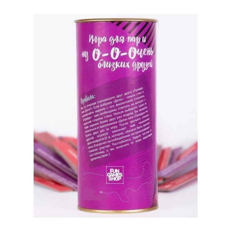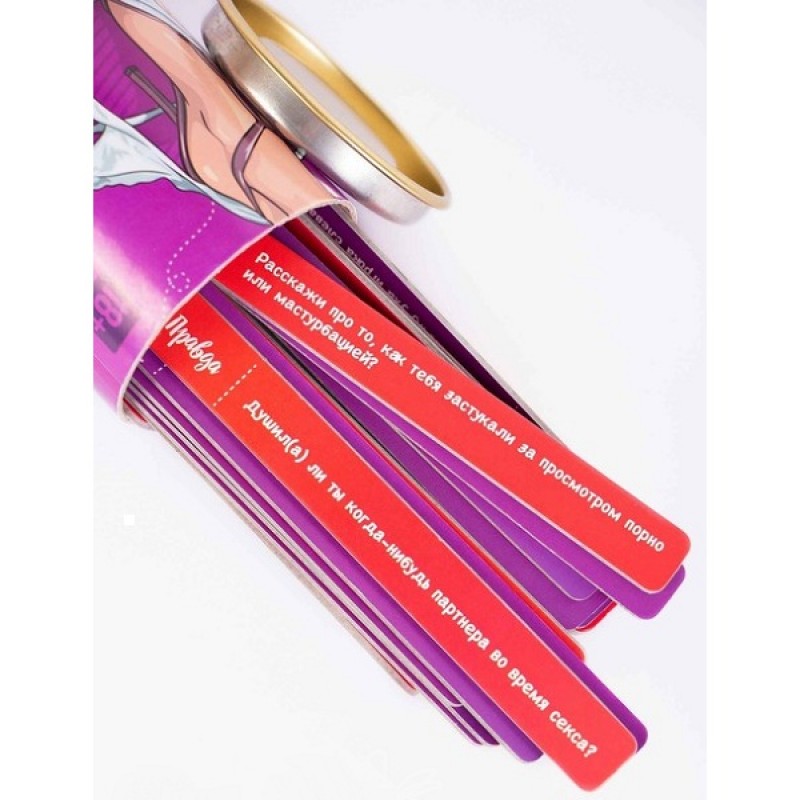 Разработчики игры в первую очередь делали упор на открытость и откровенность. Игра поможет вам раскрепоститься и сблизиться со своим любимым человеком. Тубус содержит 50 стиков с вопросами и заданиями. Возможно, многие вопросы, на которые вы давно хотите получить ответ, содержатся на красной стороне стика, а розовая сторона побудит вас к действиям, давно лежащим в вашем сознании, и вы все стесняетесь дать им волю.