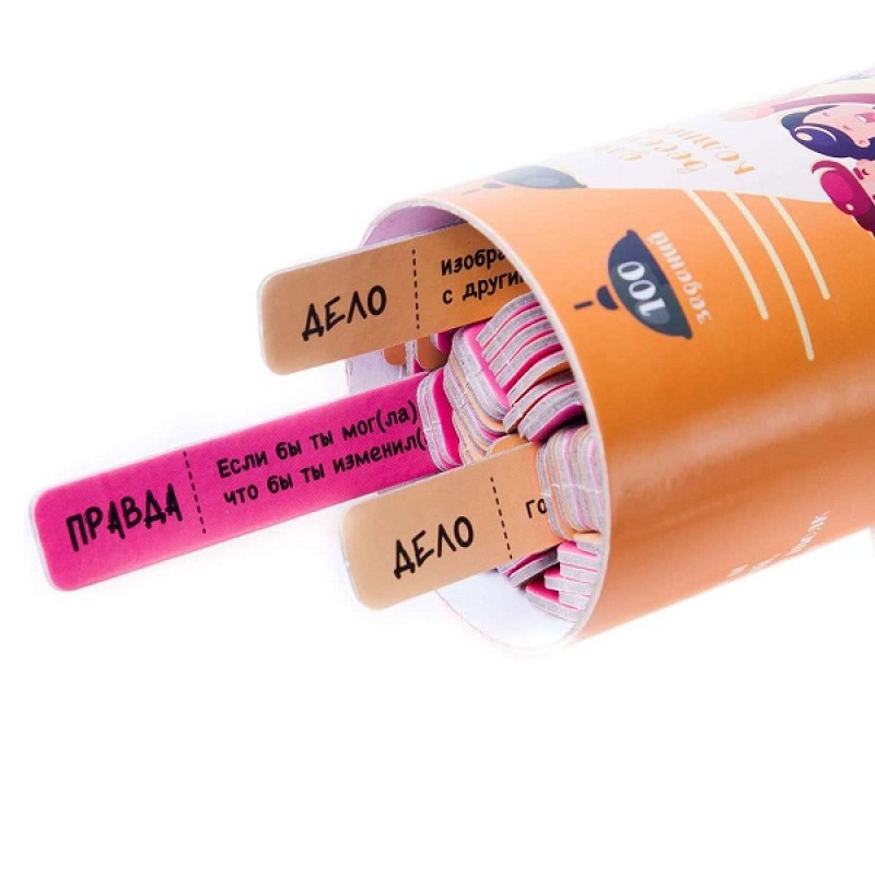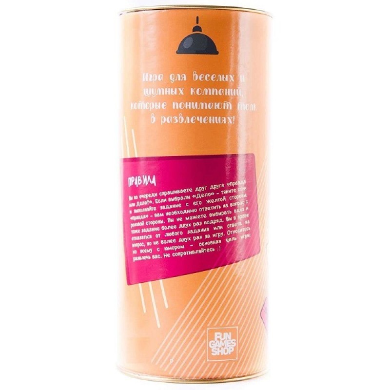 Созданная для веселых компаний, она эта игра готова отправиться в любое путешествие, на рыбалку, на горнолыжный курорт, на пляж или пикник с барбекю. Она уже упакована для этого в удобную коробку в виде тубуса и практически не займет места в Ваших вещах. И, поверьте, эта игра скрасит любой вечер. При этом подойдет и для большой компании, и в тесном кругу близких друзей, желающих выведать пикантные подробности друг о друге.