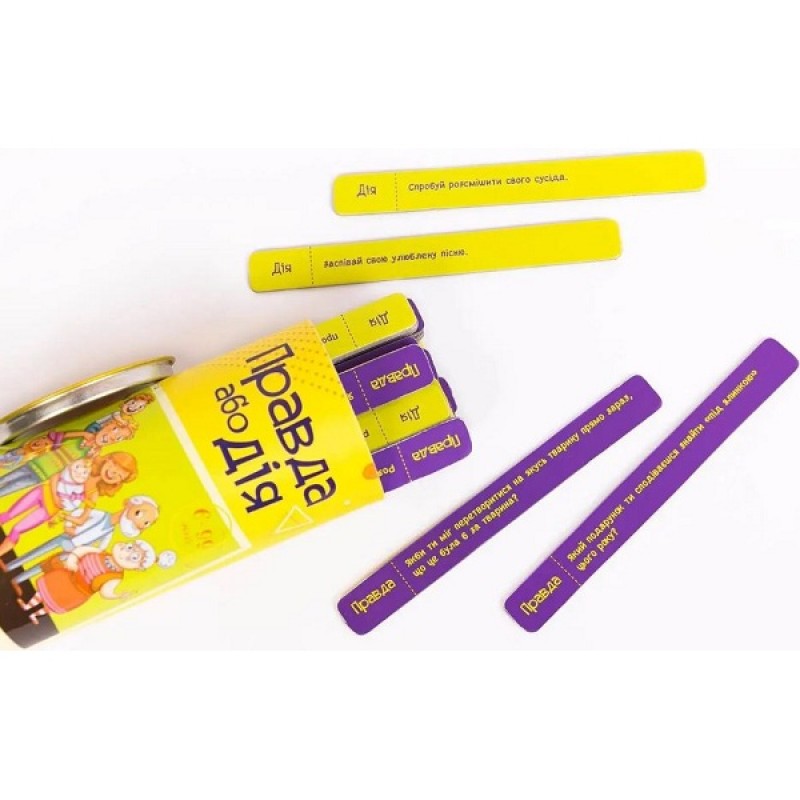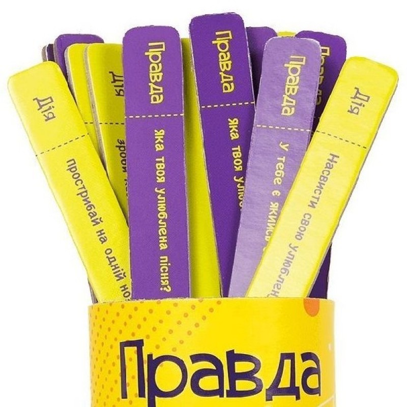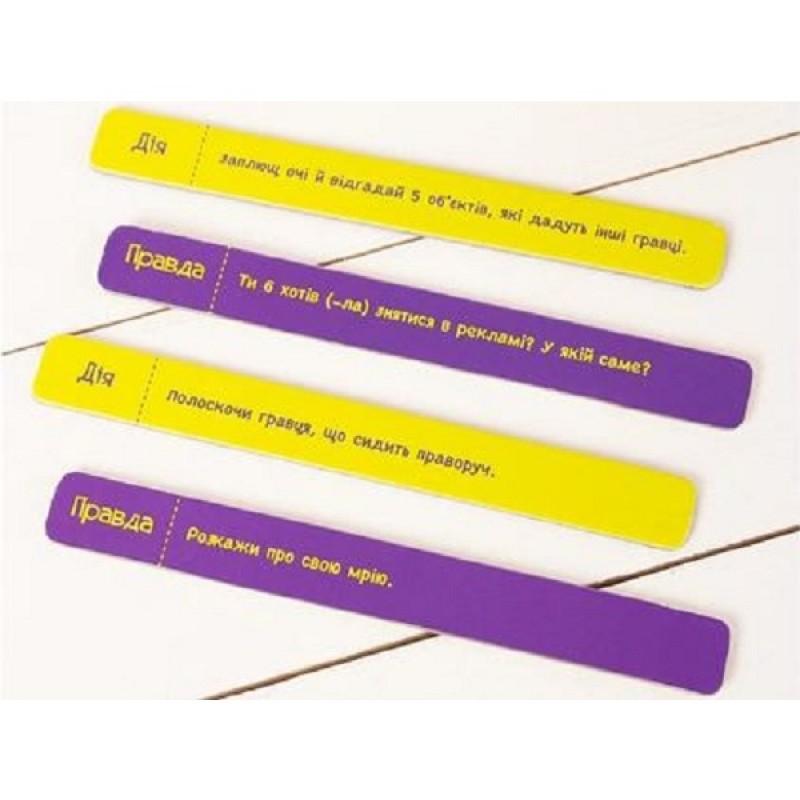 Кратко о правилах: Вы по очереди спрашиваете друг друга: «Правда» или «Дело»? Если выбрано дело, тяните стик и выполняйте задачу с его зеленой стороны. «Правда» – вам необходимо ответить на вопросы с фиолетовой стороны стика. Вы не можете выбирать ту же задачу более двух раз подряд. Если игрок не может выполнить задание или ответить на вопрос – тянет другой сток.