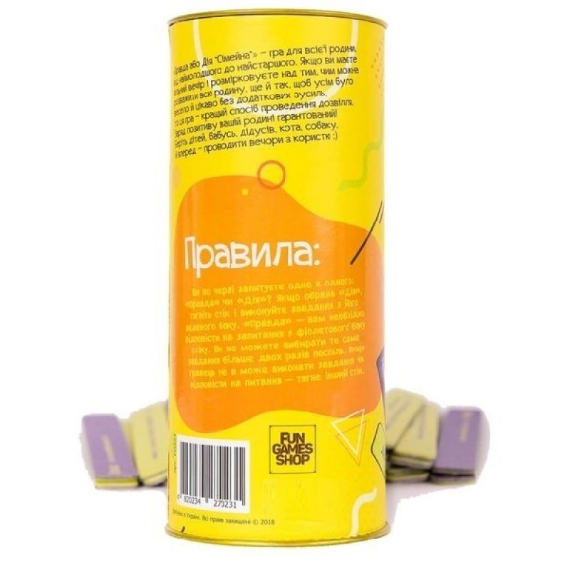 Описание: «Правда или Дело Семейная» — игра для всей семьи, от самого младшего до самого старшего. Если у вас есть свободный вечер и размышляете над тем, чем можно развлечь всю семью, еще и так, чтобы всем было весело и интересно без дополнительных усилий, то эта игра — лучший способ проведения досуга. Заряд позитива вашей семье гарантирован! Берите детей, бабушек, дедушек, кота, собаку и вперед — проводить вечера с пользой.