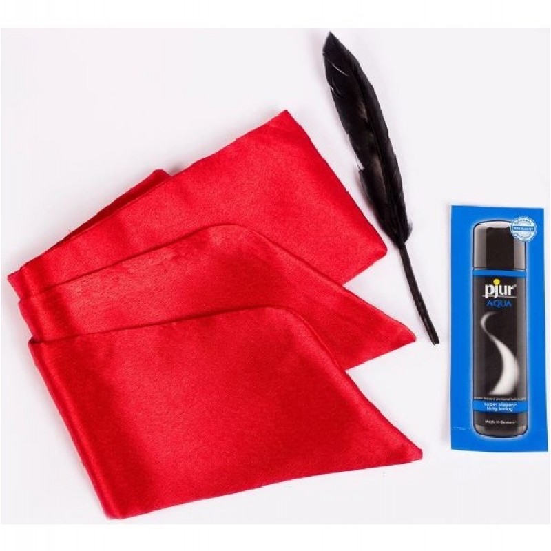 В арсенал аксессуаров для интимной игры вы получите нежное перо, ленту-повязку и лубрикант бренда Pjur, чтобы прожить особые моменты наслаждения.