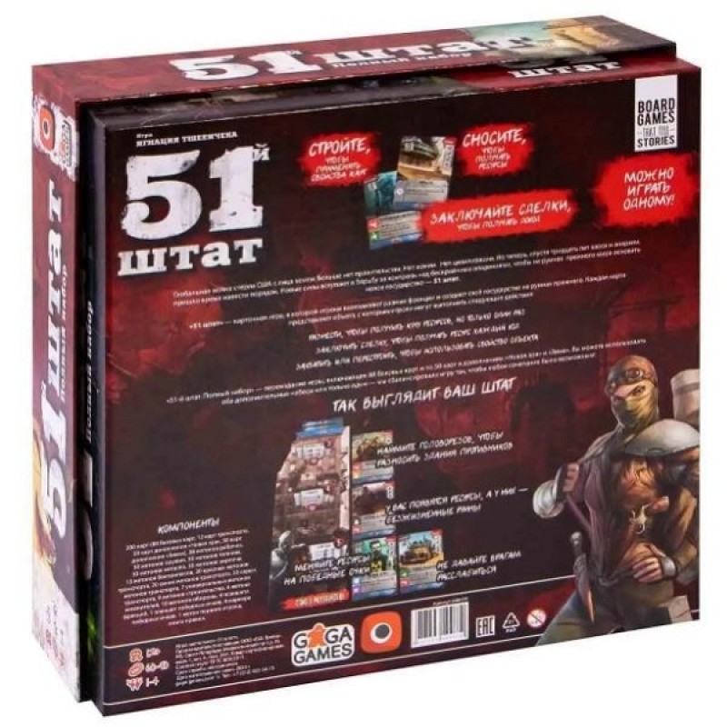 В настольной игре 51 Штат возьмите на себя ответственность за группу выживших и проложите свой путь к спасению. Вы должны восстановить. Вы должны победить. Остерегайтесь всех остальных... они пытаются сделать то же самое.