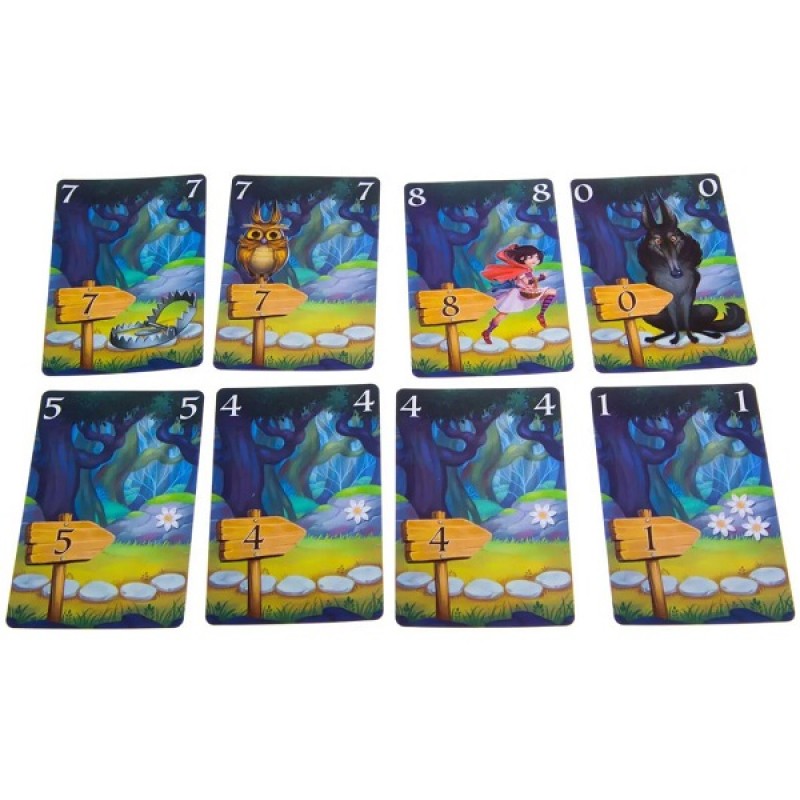 «Как бы было хорошо погулять… - мечтает девочка, – снимет игрок карту тропинки из колоды и если число на указателе окажется больше или равно количеству уже выложенных карт – мне будет проложена тропинка. А ещё на этой карте будут эффекты. Количество цветочков равно моим находкам. Эти находки мне ещё пригодятся, когда игроку достанется карта с моим изображением, или когда игрок решит отправить меня в путь, тогда мы сможем посмотреть – чего же такого интересненького я нашла. Очень хочется встретить сову, она даст возможность подсмотреть нижнюю карту в колоде». Но боится Красная Шапочка заблудиться в лесу, а это случится, если на указателе окажется число, меньше, чем количество выложенных карт. При этом Волк будет уверенно шагать по лесу.