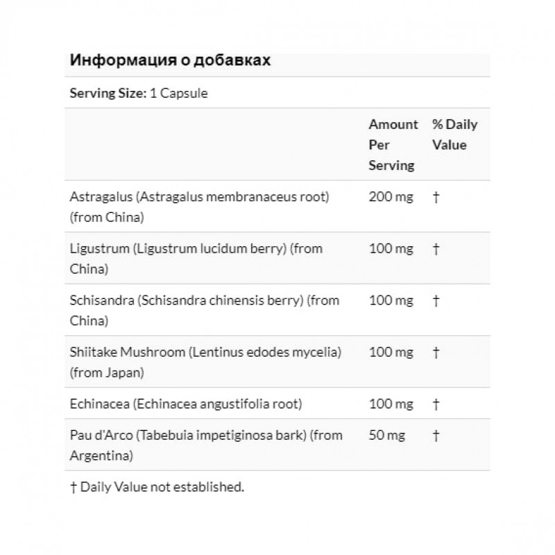- Астрагал, грибы шиитаке, эхинацея, лигуструм, лимонник и пау д'арко