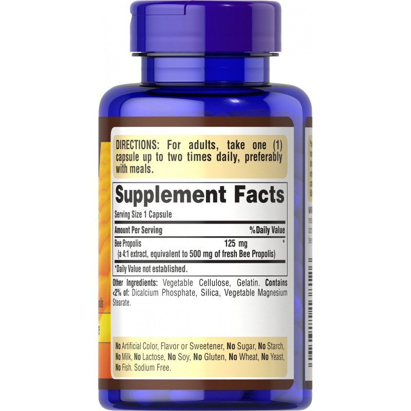 Прополис, Bee Propolis, Puritan's Pride - это продукт пчеловодства, который изготавливают пчелы, представляет собой вещество с приятным ароматом и горьким вкусом. В его состав входит комплекс биологически активных веществ, который обладает антибактерицидными, регенерирующими и противобактерийными свойствами. Известен издавна как лечебное средство. Он имеет особенность, в отличии от меда, сохранять свои свойства даже при кипячении. Bee Propolis от Puritan's Pride с дозировкой 500 мг - это основной источник биофлавоноидов и антиоксидантов. Также может использоваться как анестезирующие средство, для обезболивания.