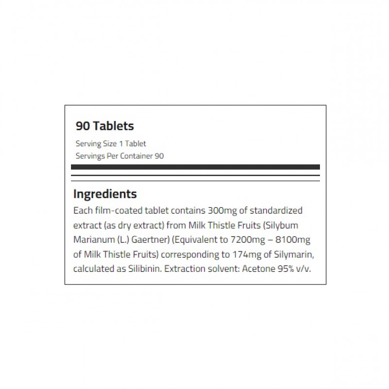 Каждая таблетка, покрытая пленкой, содержит 300 мг стандартизированного экстракта (в виде сухого экстракта) из семян расторопши (Silybum marianum (L.) Gaertner) (эквивалентно 7200 мг-8100 мг семян расторопши), что соответствует 174 мг силимарина, рассчитанного как силибинин. Экстракционный растворитель: ацетон 95%.