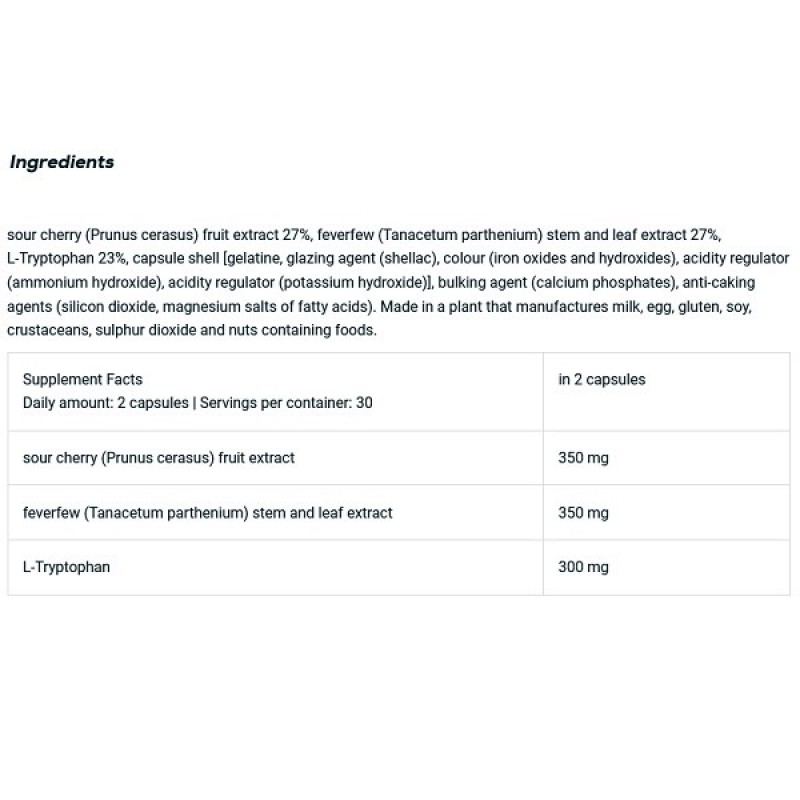 Biotech Night - биологически активная добавка на основе активных ингредиентов, влияющих на производство мелатонина, что, в свою очередь, регулирует сон. Препарат изготовлен из натуральных ингредиентов – вишневого экстракта, пиретрума девичьего и L-триптофана. Эффект препарата виден примерно через 7 дней – тогда улучшается продолжительность и качество сна. Экстракт вишни содержит высокий уровень фитохимических элементов, включая количество мелатонина. Регулярное использование помогает уснуть, увеличивает продолжительность сна и улучшает его качество. Вишня обладает антиоксидантными свойствами – защищает клетки от окислительного стресса. Экстракт пиретрума девичьего влияет на нервную систему организма. Уменьшает чувство напряжения, стресс, успокаивает нервы. L-триптофан полезен для сердца, головного мозга и нервной системы. Он необходим для правильной регенерации и восстановления сил.