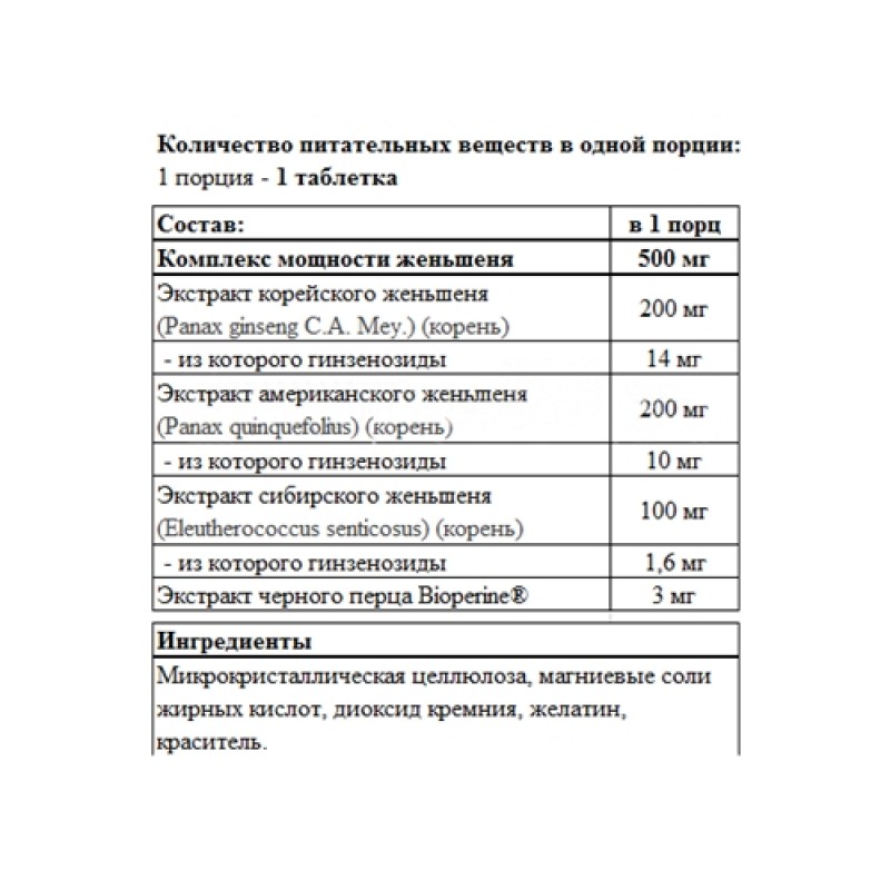 В составе добавки — экстракты трех видов женьшеня: корейского, американского и сибирского. Дополнительно состав обогащен экстрактом черного перца для лучшего усвоения препарата. При соблюдении всех рекомендаций препарат безопасен и не вызывает побочных эффектов.