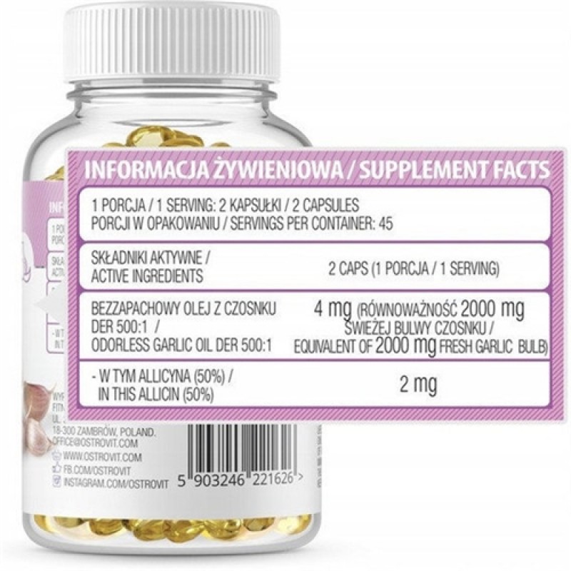 Благодаря специальной формуле масла без запаха, поместив его в гелевую капсулу, мы получили полноценный продукт со свойствами свежего чеснока. Это отличная добавка, которая может поддерживать не только правильное функционирование системы кровообращения, но также обладает антибактериальными и противогрибковыми функциями. Это может улучшить физическую форму, но не следует забывать, что чеснок на самом деле является сенсационным афродизиаком (здесь, особенно наш продукт без запаха не будет заменен). Чеснок повышает общий иммунитет организма, а также может снизить кровяное давление и высокий уровень холестерина.
