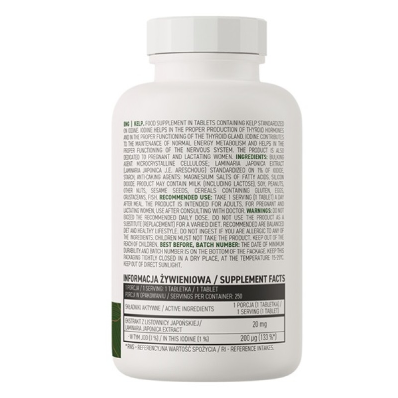 OstroVit Kelp это пищевая добавка йода. Это пищевая добавка из водоросли келп. Традиционно первое что мы знаем о йоде это его необходимость для правильной работы щитовидной железы. Йододефицит провоцирует ухудшение обмена веществ и также негативно отражается на работе сердца и даже депрессии. В этой водоросли содержится почти 40% клетчатки, которая помогает худеть и перерабатывать жиры и также улучшает работу кишечника.Добавка этой водоросли в еду не только улучшит переработку жиров но и предупредит разрастание жировой прослойки. Данная пищевая добавка водоросли помогает выводить токсины и тяжелые металлы из организма,что способствует предупреждению онкологических заболеваний.