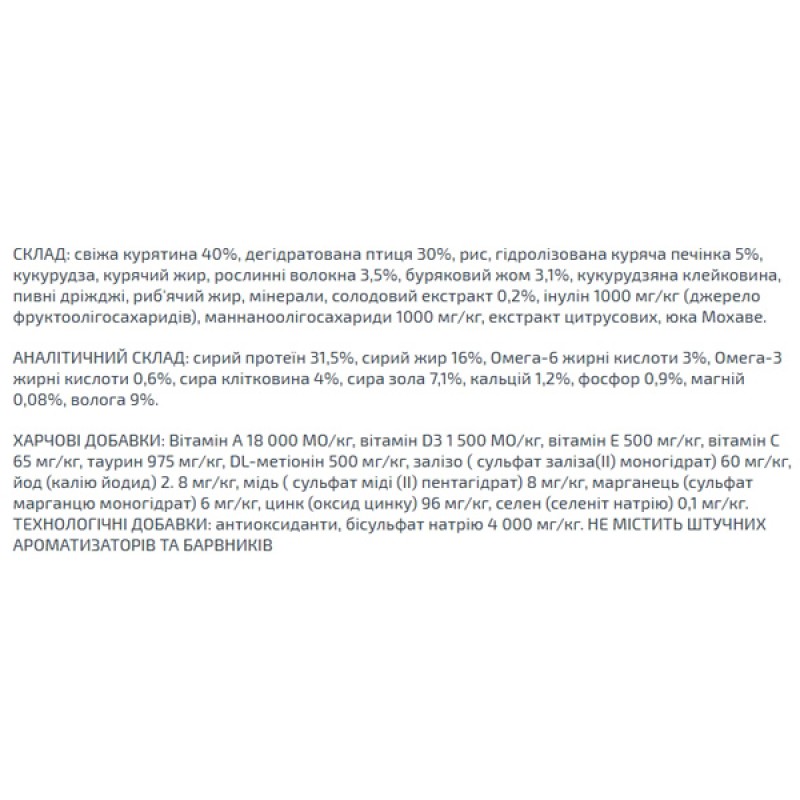 По меньшей мере, 70% свежих, обезвоженных и гидролизованных продуктов животного происхождения 1-й ингредиент.