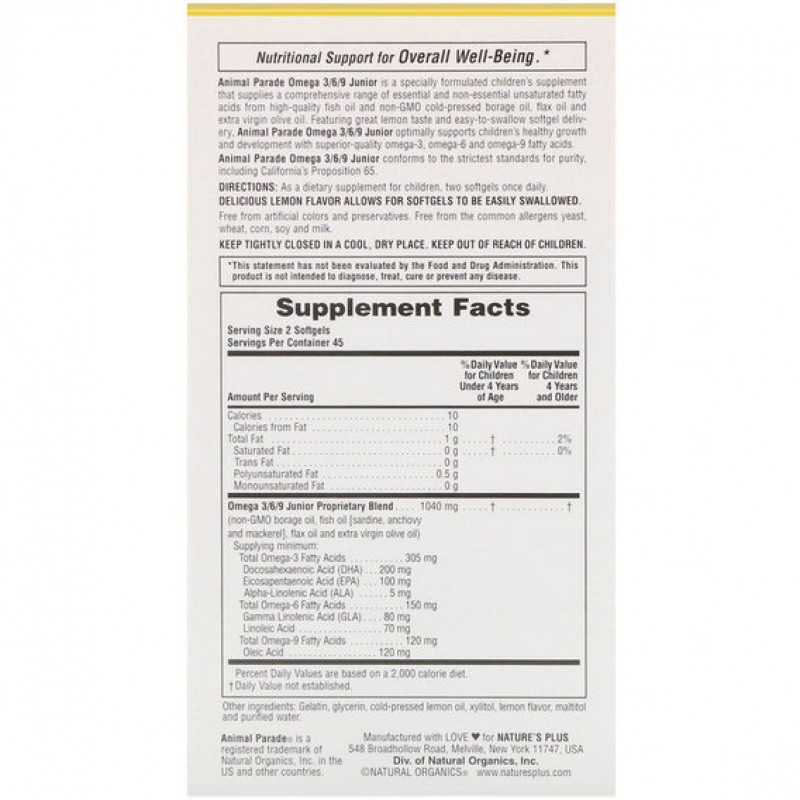 Омега 3/6/9 юниор Animal Parade — это специально разработанная добавка для детей, которая содержит полный спектр незаменимых и заменимых ненасыщенных жирных кислот из высококачественного рыбьего жира, масла бурачника, льна и оливкового масла холодного отжима (все без ГМО). Омега 3/6/9 юниор Animal Parade — это приятные на вкус мягкие таблетки, которые легко проглатывать. Они обеспечивают оптимальную поддержку роста организма ребенка с помощью высококачественных омега-3, омега-6 и омега-9 жирных кислот.