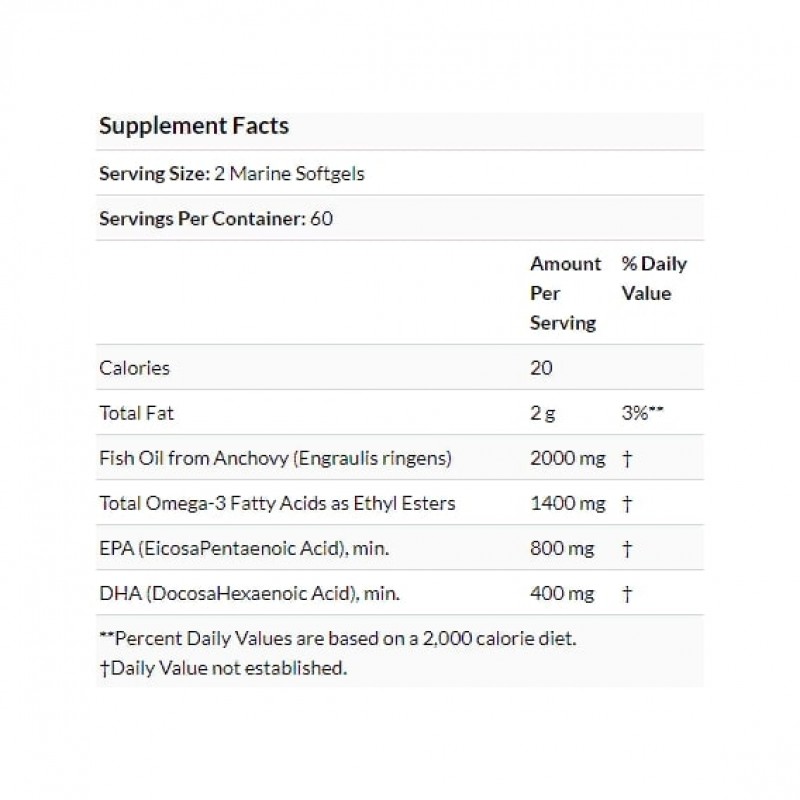 «Очищенный и прозрачный рыбий жир с омега-3» от Doctor's содержит сертифицированное чистое масло анчоусов, обитающих в южной части Тихого океана. Это масло производится с помощью запатентованного новейшего процесса фильтрации, благодаря которому достигается очень низкое значение общего коэффициента окисления Totox (показатель свежести рыбьего жира). Чем ниже значение Totox, тем лучше качество. Светлый цвет также является показателем чистоты. Чистоту и качество этого продукта, получаемого из экологических источников, можно полностью отследить. Данный чистый рыбий жир с омега-3 содержит минимум 800 мг ЭПК и 400 мг ДГК на порцию. Все омега-3 жирные кислоты поддерживают здоровье сердца, зрения, мозга и суставов.